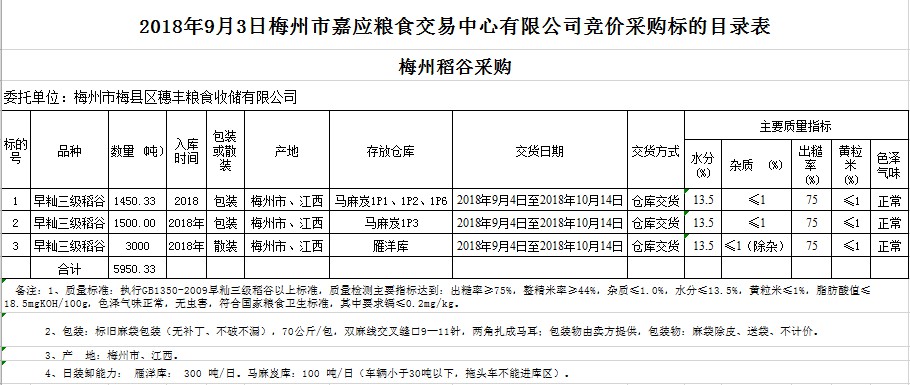 受客戶委托,梅州市嘉應糧食交易中心有限公司定于2018年9月3日(星期一)舉辦糧食競價交易會,梅州市梅縣區(qū)穗豐糧食收儲有限公司擬采購2018年早秈稻5950.33噸。