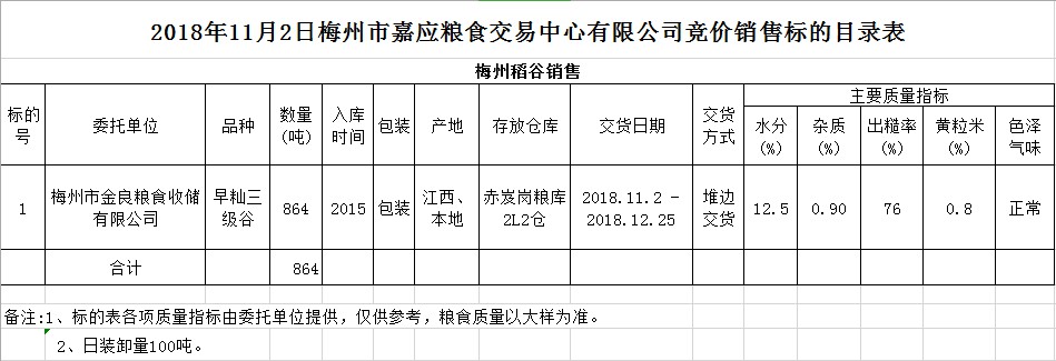 交易時間和地點:2018年11月2日(星期五)上午10時15分。廣東省梅州市彬芳大道南161號梅州市糧食交易中心3樓。