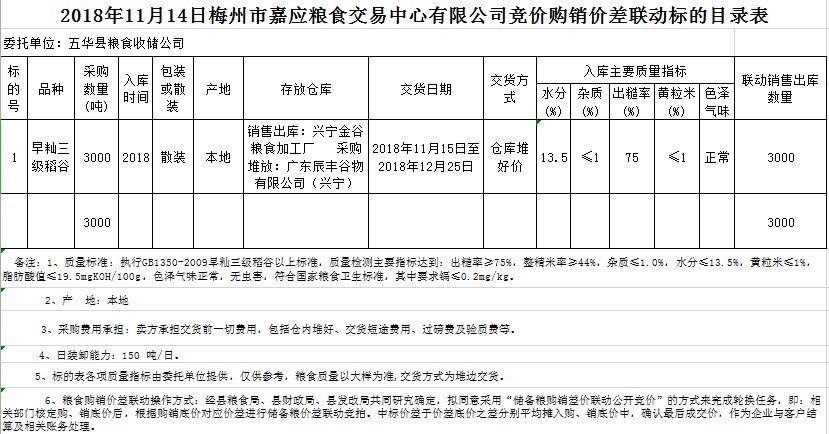 受客戶委托,梅州市嘉應(yīng)糧食交易中心有限公司定于2018年11月14日(星期三)舉辦稻谷購銷價(jià)差聯(lián)動標(biāo)的交易會,五華縣糧食收儲公司擬銷售和采購早秈稻3000噸。