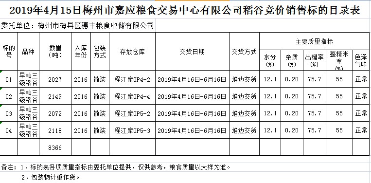受客戶(hù)委托,梅州市嘉應(yīng)糧食交易中心有限公司定于2019年4月15日(星期一)舉辦糧食競(jìng)價(jià)交易會(huì),梅州市梅縣區(qū)穗豐糧食收儲(chǔ)有限公司擬銷(xiāo)售2016年早秈稻8366噸。