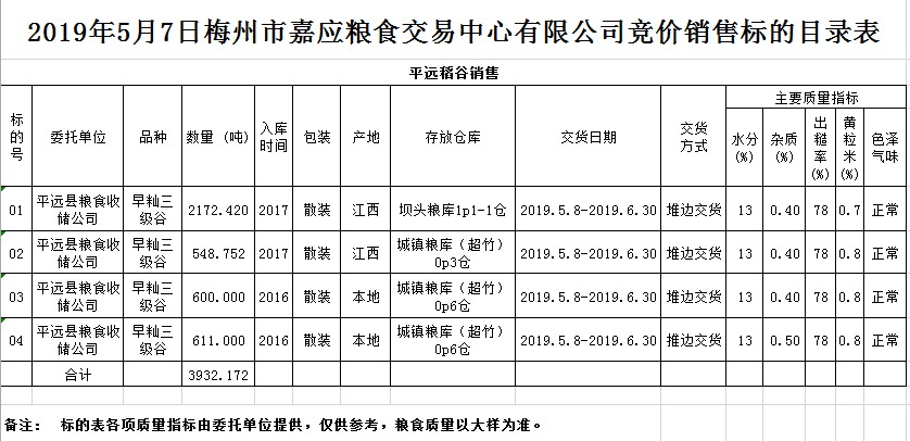 交易時(shí)間和地點(diǎn):2019年5月7日(星期二)上午10時(shí)。廣東省梅州市彬芳大道南161號梅州市糧食交易中心3樓。