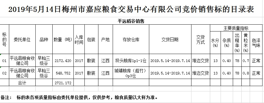 受客戶(hù)委托,梅州市嘉應(yīng)糧食交易中心有限公司定于2019年5月14日(星期二)舉辦糧食競(jìng)價(jià)交易會(huì),平遠(yuǎn)縣糧食收儲(chǔ)公司擬銷(xiāo)售2017年早秈稻2721.172噸。