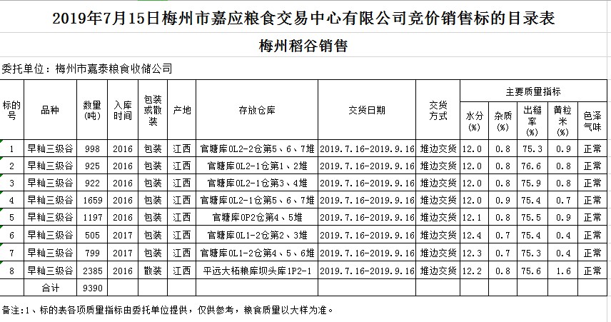 受客戶委托,梅州市嘉應(yīng)糧食交易中心有限公司定于2019年7月15日(星期一)舉辦糧食競價交易會,梅州市嘉泰糧食收儲公司擬銷售2016年、2017年早秈稻9390噸。