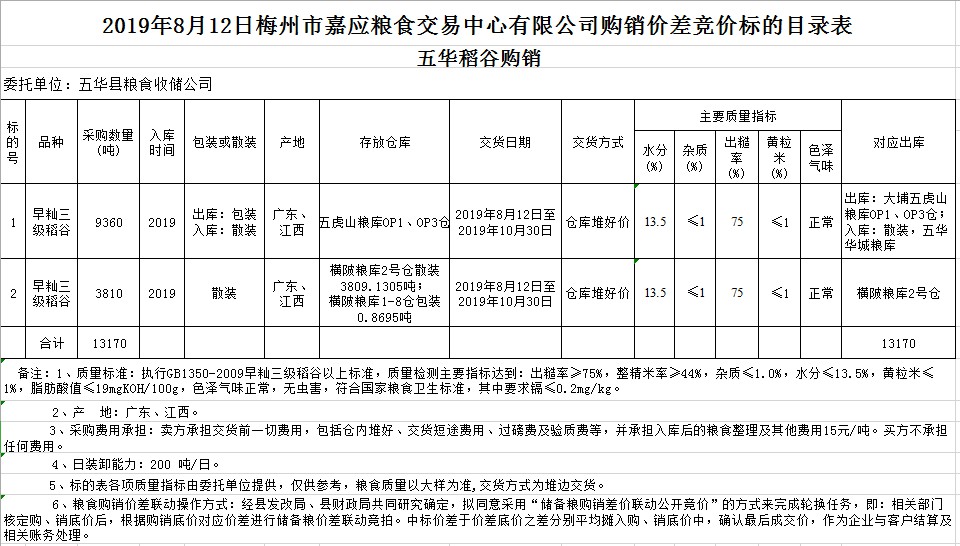 受客戶委托,梅州市嘉應糧食交易中心有限公司定于2019年8月12日(星期一)舉辦稻谷購銷價差聯(lián)動標的交易會,廣東省五華縣糧食收儲公司擬銷售和采購早秈稻13170噸。