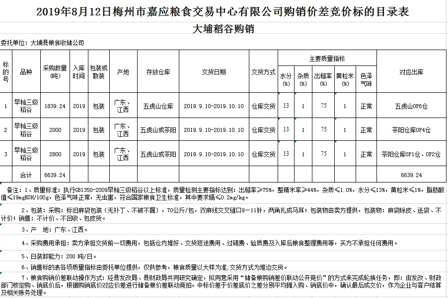 受客戶委托,梅州市嘉應(yīng)糧食交易中心有限公司定于2019年8月12日(星期一)舉辦稻谷購(gòu)銷價(jià)差聯(lián)動(dòng)標(biāo)的交易會(huì),大埔縣糧食收儲(chǔ)公司擬銷售和采購(gòu)早秈稻6639.24噸。