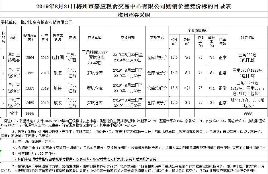 交易時(shí)間和地點(diǎn):2019年8月21日(星期三)上午10時(shí)。廣東省梅州市彬芳大道南161號(hào)梅州市糧食交易中心3樓。