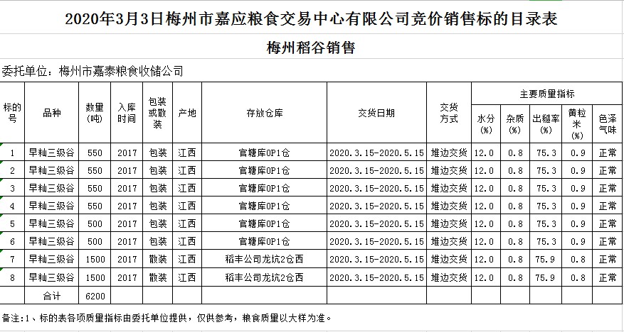 受客戶委托,梅州市嘉應(yīng)糧食交易中心有限公司定于2020年3月3日(星期二)舉辦糧食競(jìng)價(jià)交易會(huì),梅州市嘉泰糧食收儲(chǔ)公司擬銷售2017年早秈稻6200噸。