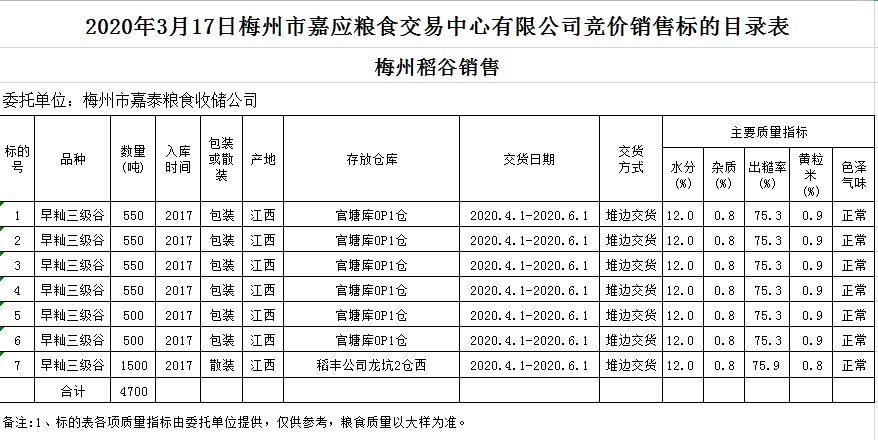 受客戶委托,梅州市嘉應(yīng)糧食交易中心有限公司定于2020年3月17日(星期二)舉辦糧食競價交易會,梅州市嘉泰糧食收儲公司擬銷售2017年早秈稻4700噸。