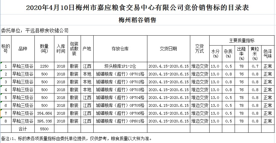 受客戶委托,梅州市嘉應(yīng)糧食交易中心有限公司定于2020年4月10日(星期五)舉辦糧食競價(jià)交易會(huì),平遠(yuǎn)縣糧食收儲(chǔ)公司擬銷售2018年早秈稻5500噸。