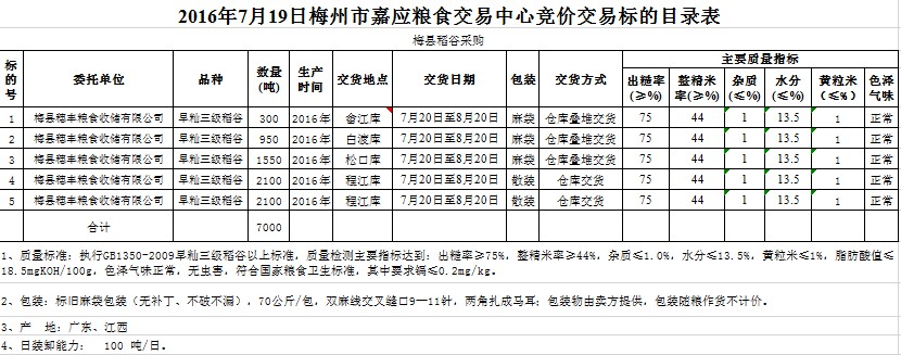 受客戶委托,梅州市嘉應(yīng)糧食交易中心有限公司定于2016年7月19日舉辦糧食競(jìng)價(jià)交易會(huì),梅州市梅縣區(qū)穗豐糧食收儲(chǔ)有限公司擬采購(gòu)2016年產(chǎn)早秈三級(jí)稻谷7000噸。