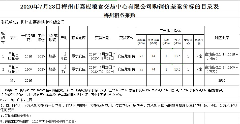 受客戶委托,梅州市嘉應(yīng)糧食交易中心有限公司定于2020年7月28日(星期二)舉辦稻谷購銷價(jià)差聯(lián)動(dòng)標(biāo)的交易會(huì),梅州市嘉泰糧食收儲(chǔ)公司擬銷售和采購早秈稻2616噸。
