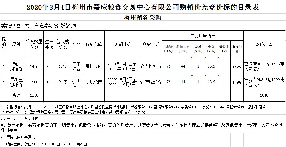 受客戶委托,梅州市嘉應(yīng)糧食交易中心有限公司定于2020年8月4日(星期二)舉辦稻谷購銷價(jià)差聯(lián)動(dòng)標(biāo)的交易會(huì),梅州市嘉泰糧食收儲(chǔ)公司擬銷售和采購早秈稻2616噸。