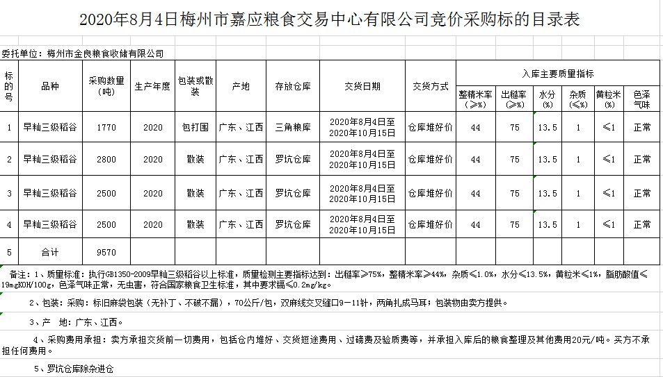 交易時間和地點:2020年8月4日(星期二)上午10時15分。廣東省梅州市彬芳大道南161號梅州市糧食交易中心3樓。