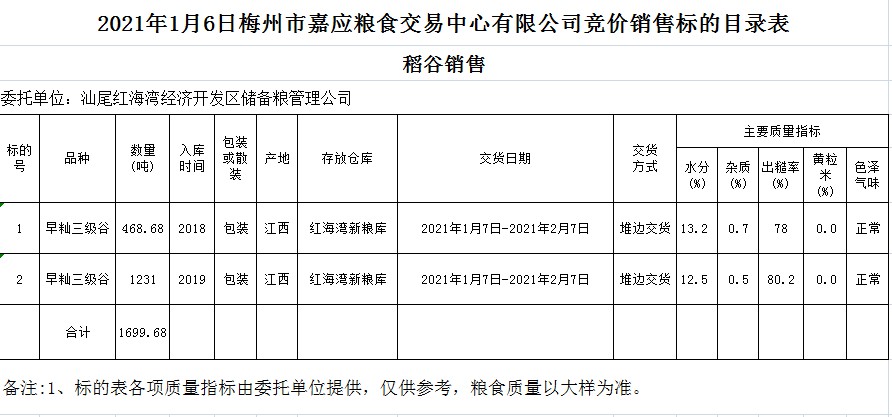 受客戶委托,梅州市嘉應(yīng)糧食交易中心有限公司定于2021年1月6日(星期三)舉辦糧食競價(jià)交易會,汕尾紅海灣經(jīng)濟(jì)開發(fā)區(qū)儲備糧管理公司擬銷售2018年早秈三級稻谷468.68噸;2019年早秈三級稻谷1231噸。