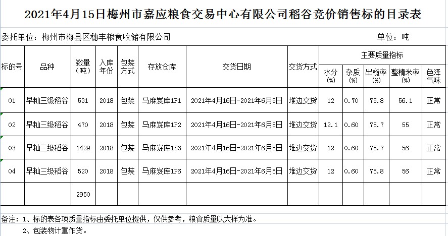 受客戶委托,梅州市嘉應(yīng)糧食交易中心有限公司定于2021年4月15日(星期四)舉辦糧食競(jìng)價(jià)交易會(huì)。梅州市梅縣區(qū)穗豐糧食收儲(chǔ)有限公司擬銷售2018年早秈稻2950噸。