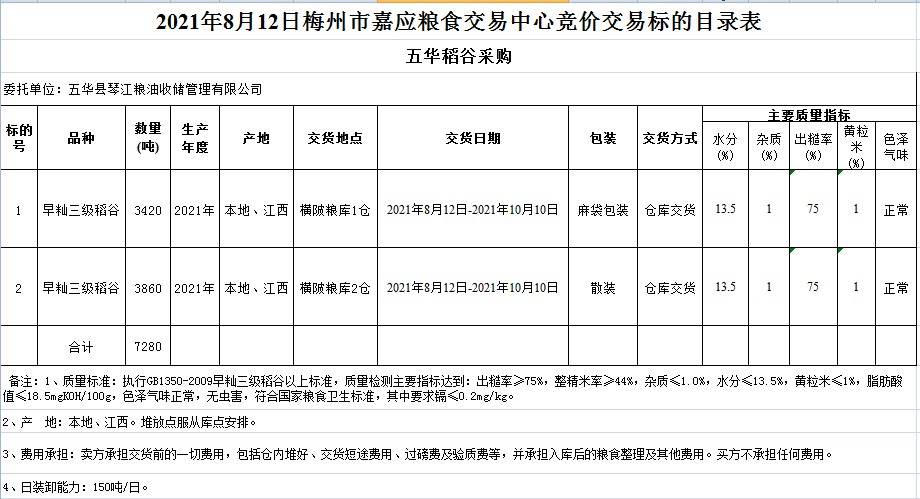 受客戶委托,梅州市嘉應(yīng)糧食交易中心有限公司定于2021年8月12日(星期四)舉辦糧食競價交易會。五華縣琴江糧油收儲管理有限公司擬采購2021年早秈稻7280噸。