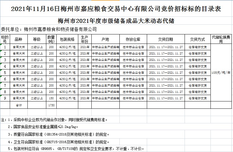 受客戶委托,梅州市嘉應(yīng)糧食交易中心有限公司定于2021年11月16日(星期二)上午10時在廣東省梅州市彬芳大道南161號梅州市糧食交易中心3樓,舉辦梅州市市級儲備成品糧油新一輪動態(tài)代儲采購及包干輪換費(fèi)公開招標(biāo)。