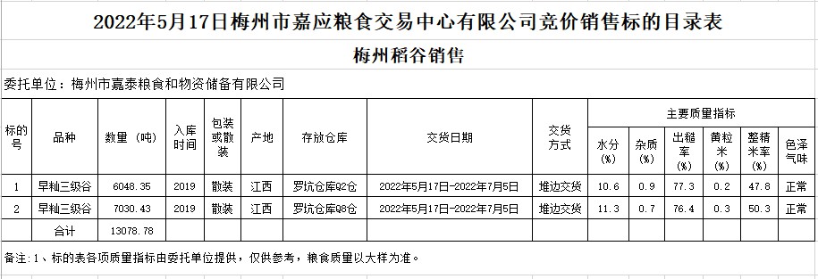 受客戶委托,梅州市嘉應糧食交易中心有限公司定于2022年5月17日(星期二)舉辦糧食競價交易會。梅州市嘉泰糧食和物資儲備有限公司擬銷售2019年早秈稻13078.78噸。