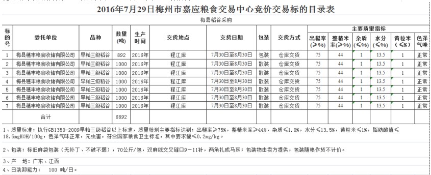 受客戶委托,梅州市嘉應(yīng)糧食交易中心有限公司定于2016年7月29日舉辦糧食競(jìng)價(jià)交易會(huì),梅州市梅縣區(qū)穗豐糧食收儲(chǔ)有限公司擬采購(gòu)2016年產(chǎn)早秈三級(jí)稻谷6892噸。