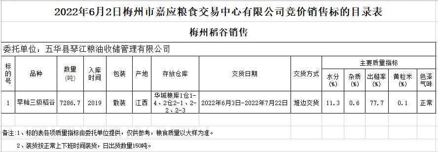 受客戶委托,梅州市嘉應(yīng)糧食交易中心有限公司定于2022年6月2日(星期四)舉辦糧食競價(jià)交易會。五華縣琴江糧油收儲管理有限公司擬銷售2019年早秈稻7286.7噸。