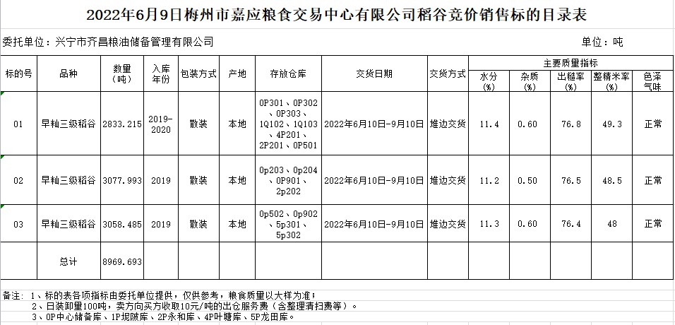 受客戶委托,梅州市嘉應(yīng)糧食交易中心有限公司定于2022年6月9日(星期四)舉辦糧食競價(jià)交易會(huì)。興寧市齊昌糧油儲(chǔ)備管理有限公司擬銷售2019、2020年早秈稻8969.693噸。