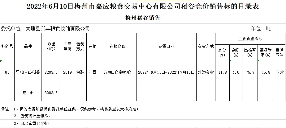受客戶委托,梅州市嘉應(yīng)糧食交易中心有限公司定于2022年6月10日(星期五)舉辦糧食競(jìng)價(jià)交易會(huì)。大埔縣興豐糧食收儲(chǔ)有限公司擬銷售2019年早秈稻3283.6噸。