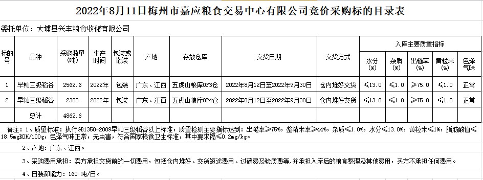 受客戶委托,梅州市嘉應(yīng)糧食交易中心有限公司定于2022年8月11日(星期四)舉辦糧食競(jìng)價(jià)交易會(huì)。大埔縣興豐糧食收儲(chǔ)有限公司擬采購(gòu)2022年早秈稻4862.6噸。