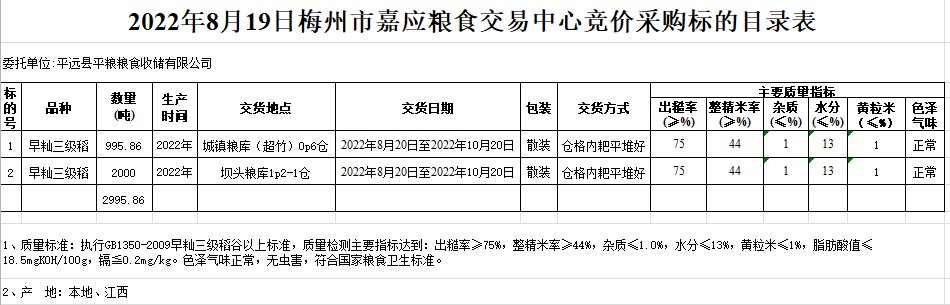 受客戶委托,梅州市嘉應(yīng)糧食交易中心有限公司定于2022年8月19日(星期五)舉辦糧食競價交易會。平遠(yuǎn)縣平糧糧食收儲有限公司擬采購2022年早秈稻2995.86噸。