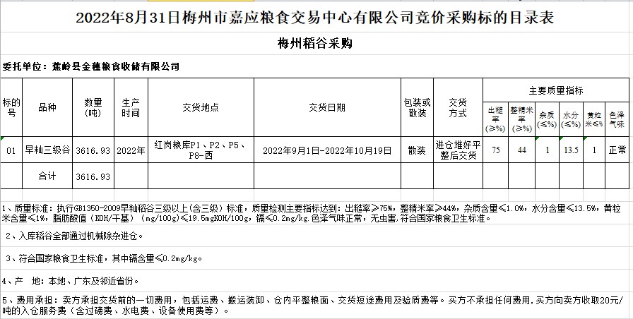 受客戶委托,梅州市嘉應(yīng)糧食交易中心有限公司定于2022年8月31日(星期三)舉辦糧食競價交易會。蕉嶺縣金穗糧食收儲有限公司擬采購2022年早秈稻3616.93噸。