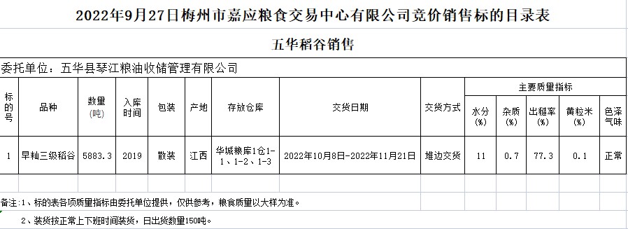 受客戶委托,梅州市嘉應(yīng)糧食交易中心有限公司定于2022年9月27日(星期二)舉辦糧食競價交易會。五華縣琴江糧油收儲管理有限公司擬銷售2019年早秈稻5883.3噸。