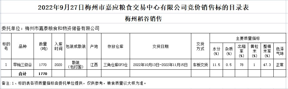 受客戶委托,梅州市嘉應(yīng)糧食交易中心有限公司定于2022年9月27日(星期二)舉辦糧食競價交易會。梅州市嘉泰糧食和物資儲備有限公司擬銷售2020年早秈稻1770噸。
