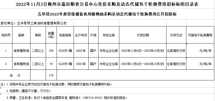 食用植物油170噸,等級二級以上、包裝規(guī)格≤20升/桶, 動態(tài)代儲包干輪換期限為三年。