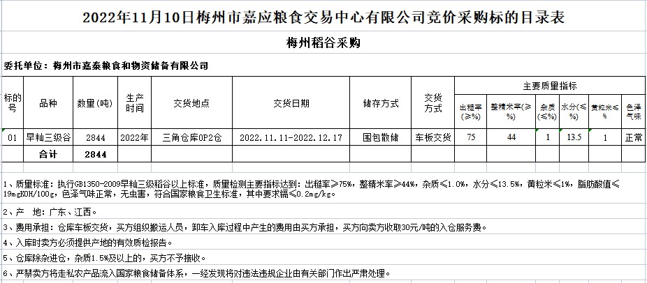 受客戶委托,梅州市嘉應(yīng)糧食交易中心有限公司定于2022年11月10日(星期四)舉辦糧食競價交易會。梅州市嘉泰糧食和物資儲備有限公司擬采購2022年早秈稻2844噸。