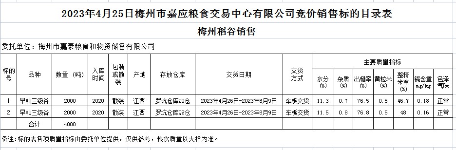 受客戶委托,梅州市嘉應(yīng)糧食交易中心有限公司定于2023年4月25日(星期二)舉辦糧食競價(jià)交易會。梅州市嘉泰糧食和物資儲備有限公司擬銷售2020年早秈稻4000噸。