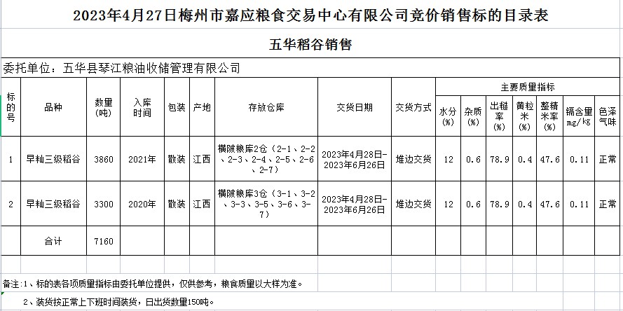 受客戶(hù)委托,梅州市嘉應(yīng)糧食交易中心有限公司定于2023年4月27日(星期四)舉辦糧食競(jìng)價(jià)交易會(huì)。五華縣琴江糧油收儲(chǔ)管理有限公司擬銷(xiāo)售2020、2021年早秈稻7160噸。