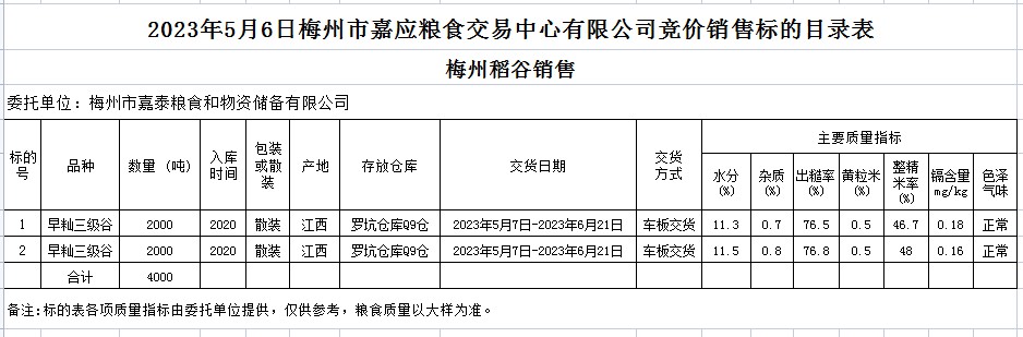 受客戶委托,梅州市嘉應糧食交易中心有限公司定于2023年5月6日(星期六)舉辦糧食競價交易會。梅州市嘉泰糧食和物資儲備有限公司擬銷售2020年早秈稻4000噸。