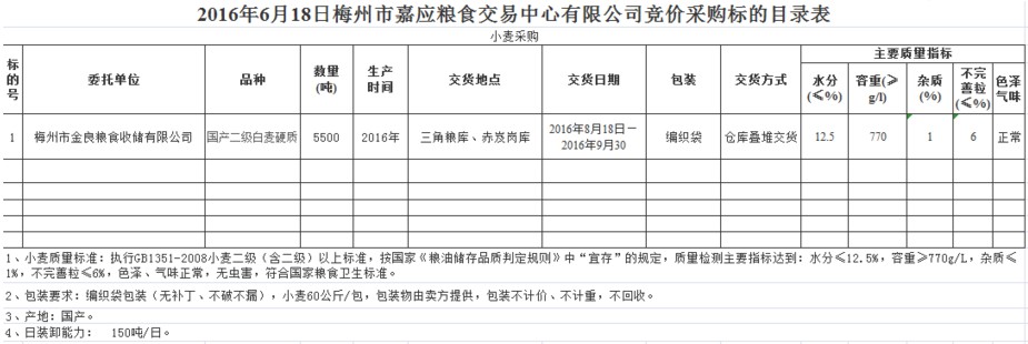 受客戶委托,梅州市嘉應(yīng)糧食交易中心有限公司定于2016年8月18日舉辦糧食競(jìng)價(jià)交易會(huì),梅州市金良糧食收儲(chǔ)有限公司擬采購(gòu)2016年產(chǎn)二級(jí)硬質(zhì)小麥5500噸。