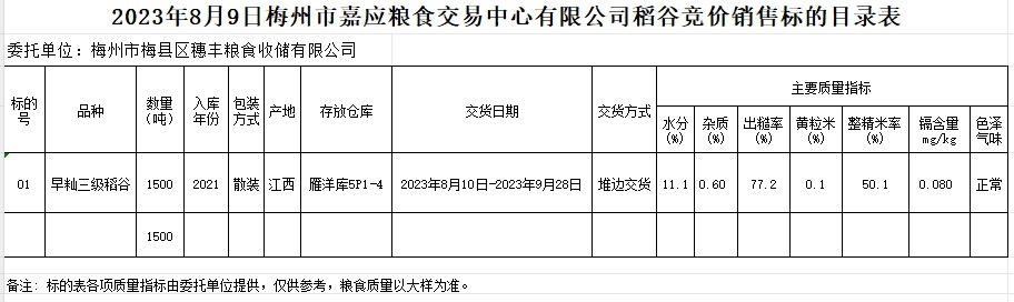 受客戶(hù)委托,梅州市嘉應(yīng)糧食交易中心有限公司定于2023年8月9日(星期三)舉辦糧食競(jìng)價(jià)交易會(huì)。梅州市梅縣區(qū)穗豐糧食收儲(chǔ)有限公司擬銷(xiāo)售2021年早秈稻1500噸。