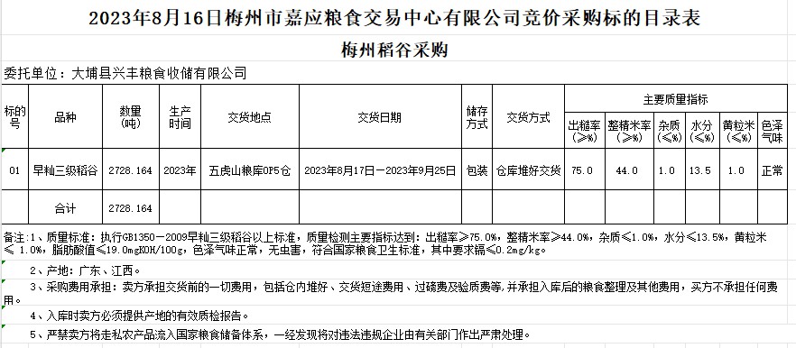 受客戶委托,梅州市嘉應(yīng)糧食交易中心有限公司定于2023年8月16日(星期三)舉辦糧食競價交易會。大埔縣興豐糧食收儲有限公司擬采購2023年早秈稻2728.164噸。