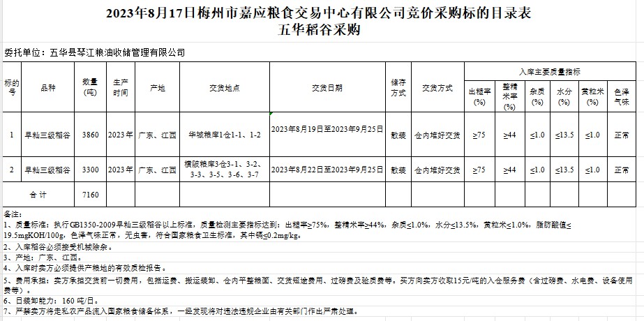 受客戶委托,梅州市嘉應(yīng)糧食交易中心有限公司定于2023年8月17日(星期四)舉辦糧食競價交易會。五華縣琴江糧油收儲管理有限公司擬采購2023年早秈稻7160噸。