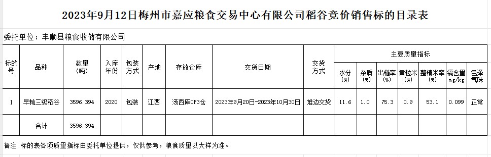 受客戶委托,梅州市嘉應(yīng)糧食交易中心有限公司定于2023年9月12日(星期二)舉辦糧食競價交易會。豐順縣糧食收儲有限公司擬銷售2020年早秈稻3596.394噸。