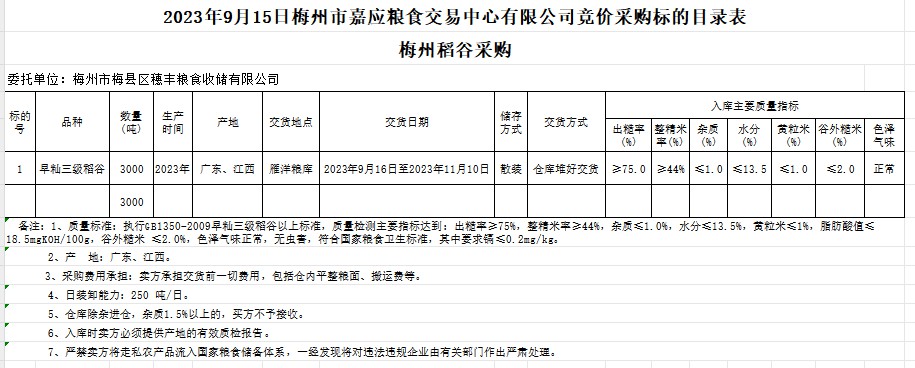 受客戶委托,梅州市嘉應(yīng)糧食交易中心有限公司定于2023年9月15日(星期五)舉辦糧食競(jìng)價(jià)交易會(huì)。梅州市梅縣區(qū)穗豐糧食收儲(chǔ)有限公司擬采購2023年產(chǎn)早秈稻3000噸。
