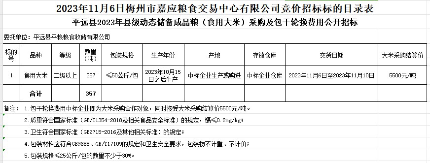 受客戶委托,梅州市嘉應(yīng)糧食交易中心有限公司定于2023年11月6日(星期一)上午10時(shí)在廣東省梅州市彬芳大道南161號(hào)梅州市糧食交易中心3樓,舉辦平遠(yuǎn)縣2023年縣級(jí)動(dòng)態(tài)儲(chǔ)備成品糧(食用大米)采購(gòu)及包干輪換費(fèi)用公開(kāi)招標(biāo)。