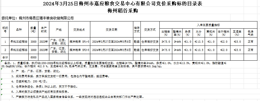 受客戶委托,梅州市嘉應(yīng)糧食交易中心有限公司定于2024年3月25日(星期一)舉辦糧食競價(jià)交易會。梅州市梅縣區(qū)穗豐糧食收儲有限公司擬采購2023年產(chǎn)早秈稻6000噸。