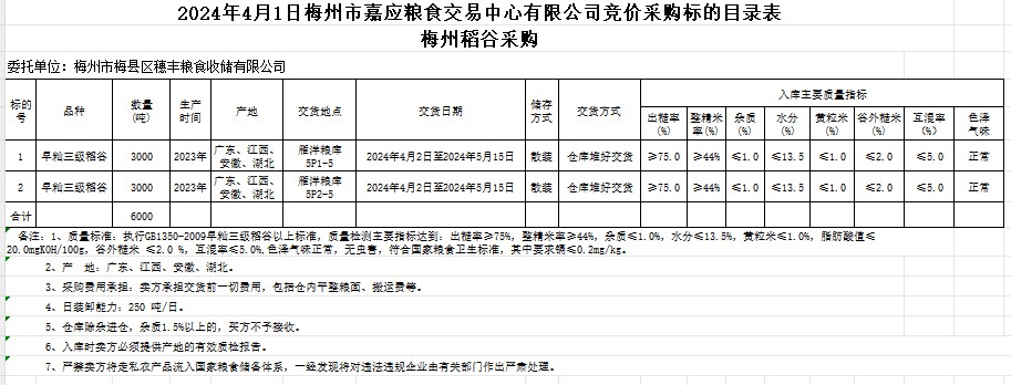 受客戶委托,梅州市嘉應糧食交易中心有限公司定于2024年4月1日(星期一)舉辦糧食競價交易會。梅州市梅縣區(qū)穗豐糧食收儲有限公司擬采購2023年產早秈稻6000噸。