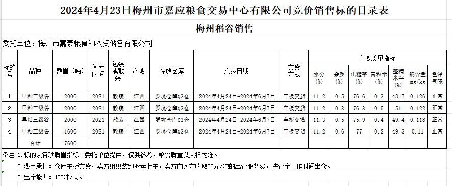 受客戶委托,梅州市嘉應糧食交易中心有限公司定于2024年4月23日(星期二)舉辦糧食競價交易會。梅州市嘉泰糧食和物資儲備有限公司擬銷售2021年產(chǎn)早秈稻7600噸。