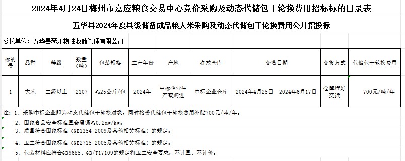 五華縣2024年度縣級(jí)儲(chǔ)備成品糧大米采購(gòu)及動(dòng)態(tài)代儲(chǔ)包干輪換費(fèi)用公開(kāi)招標(biāo)公告