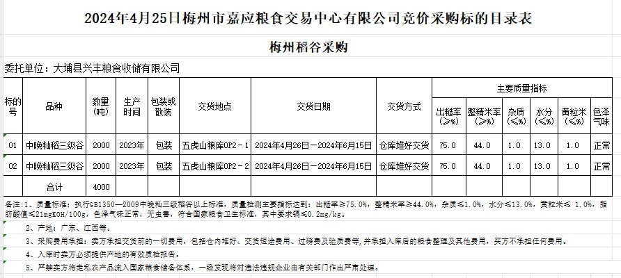 受客戶委托,梅州市嘉應(yīng)糧食交易中心有限公司定于2024年4月25日(星期四)舉辦糧食競(jìng)價(jià)交易會(huì)。大埔縣興豐糧食收儲(chǔ)有限公司擬采購2023年產(chǎn)中晚秈稻谷4000噸。