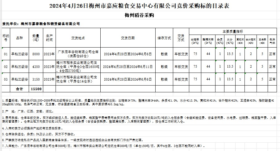 受客戶委托,梅州市嘉應(yīng)糧食交易中心有限公司定于2024年4月26日(星期五)舉辦糧食競(jìng)價(jià)交易會(huì)。梅州市嘉泰糧食和物資儲(chǔ)備有限公司擬采購(gòu)2023年產(chǎn)早秈稻15500噸。