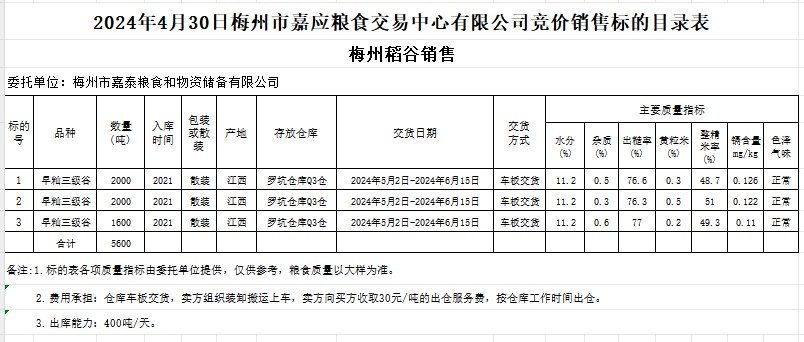 受客戶委托,梅州市嘉應(yīng)糧食交易中心有限公司定于2024年4月30日(星期二)舉辦糧食競(jìng)價(jià)交易會(huì)。梅州市嘉泰糧食和物資儲(chǔ)備有限公司擬銷售2021年早秈稻5600噸。